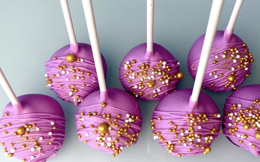 Decadent cake lollipop on a stick! These pretty desserts are cake mixed with Buttercream and enrobed in couverture chocolate and decorated with sprinkles.